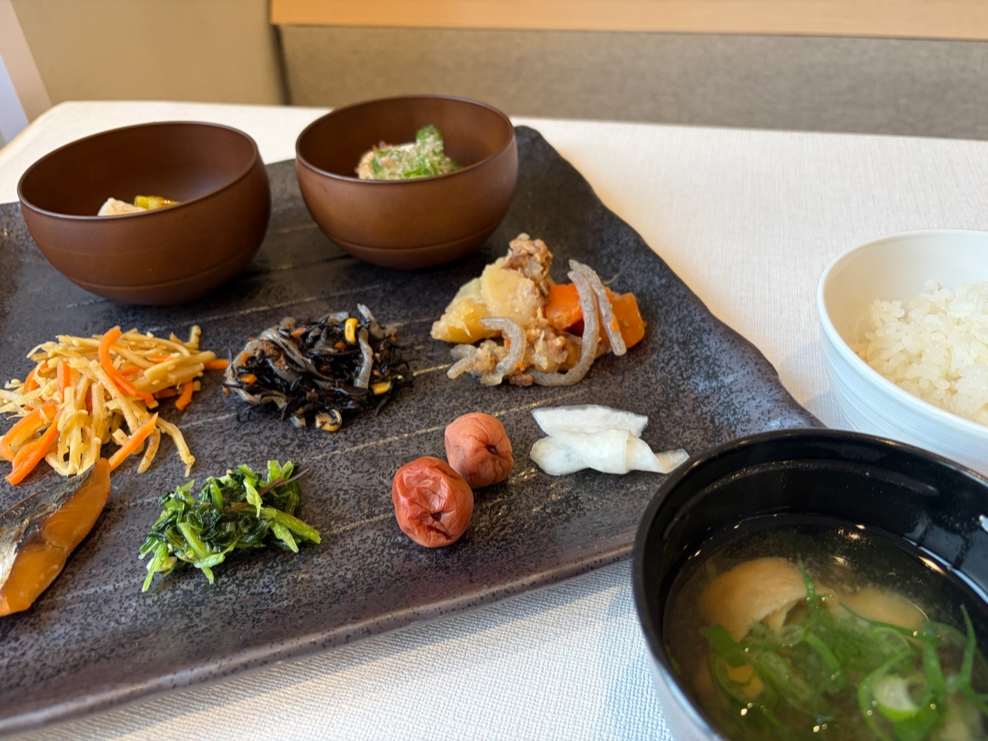 京都の魅力をアレンジした、九条ネギのお味噌汁、にしんそば、湯豆腐などの和食も充実。